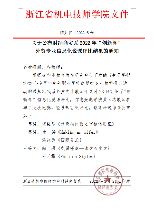 關于公布财經商貿系2022年(nián)“創新杯” 外(wài)貿專業(yè)信息化(huà)說(shuō)課評比結果的(de)通(tōng)知(zhī)