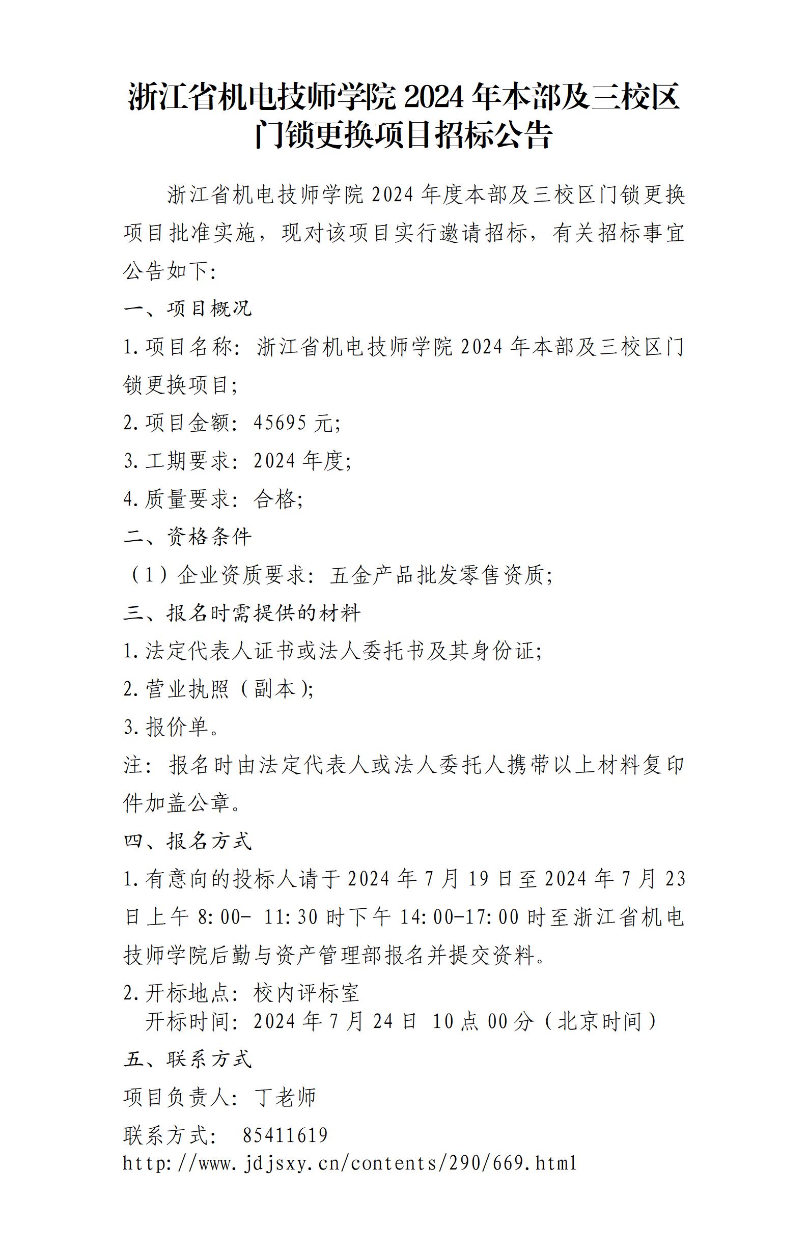 浙江省機電技師學院2024年(nián)本部及三校(xiào)區(qū)門(mén)鎖更換項目招标公告