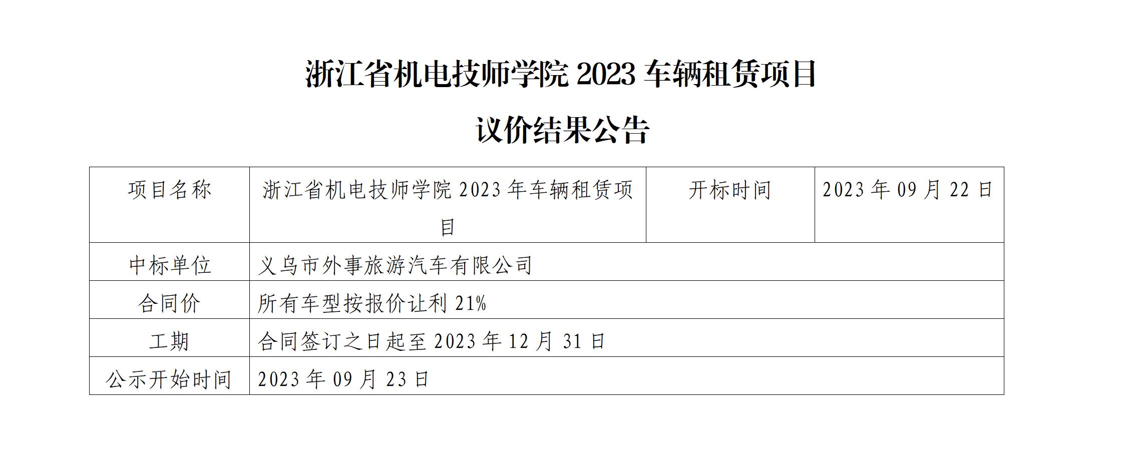 浙江省機電技師學院2023車(chē)輛(liàng)租賃項目議(yì)價結果公告