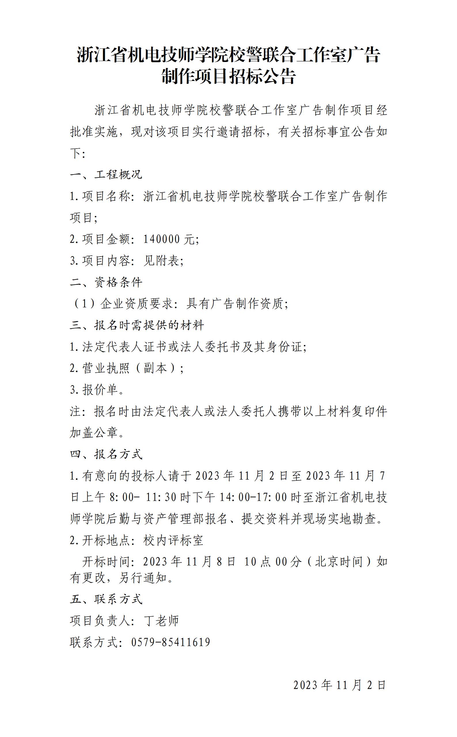浙江省機電技師學院校(xiào)警聯合工(gōng)作(zuò)室廣告制(zhì)作(zuò)項目招标公告