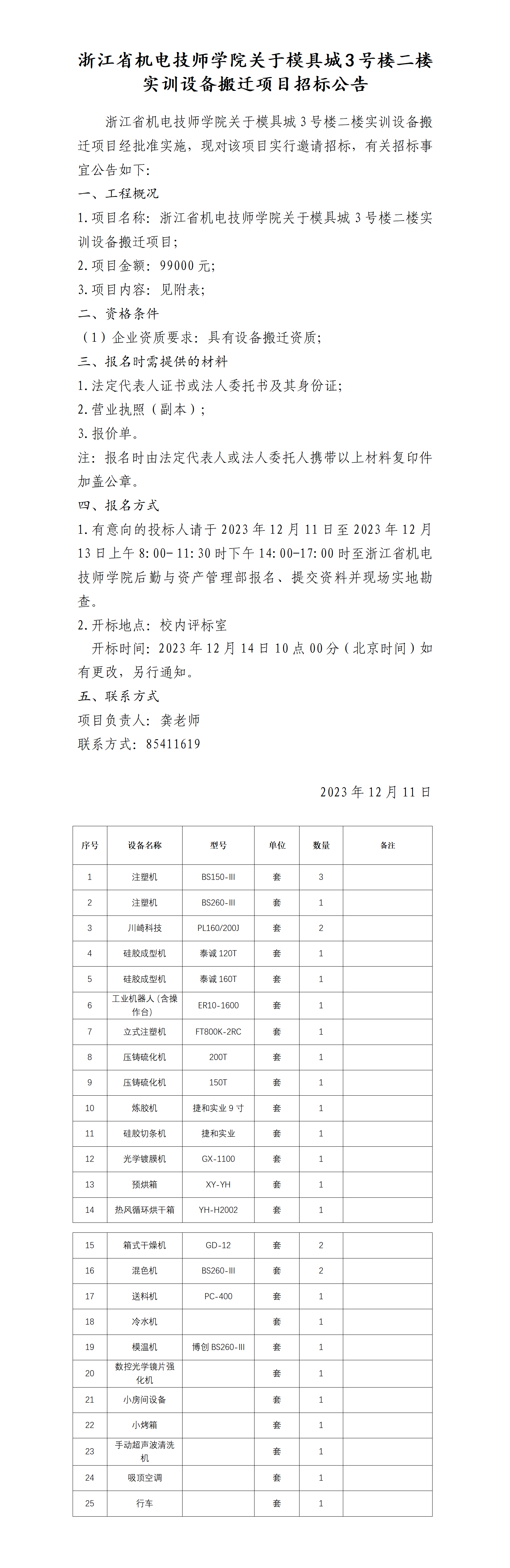 浙江省機電技師學院關于模具城(chéng)3号樓二樓實訓設備搬遷項目招标公告