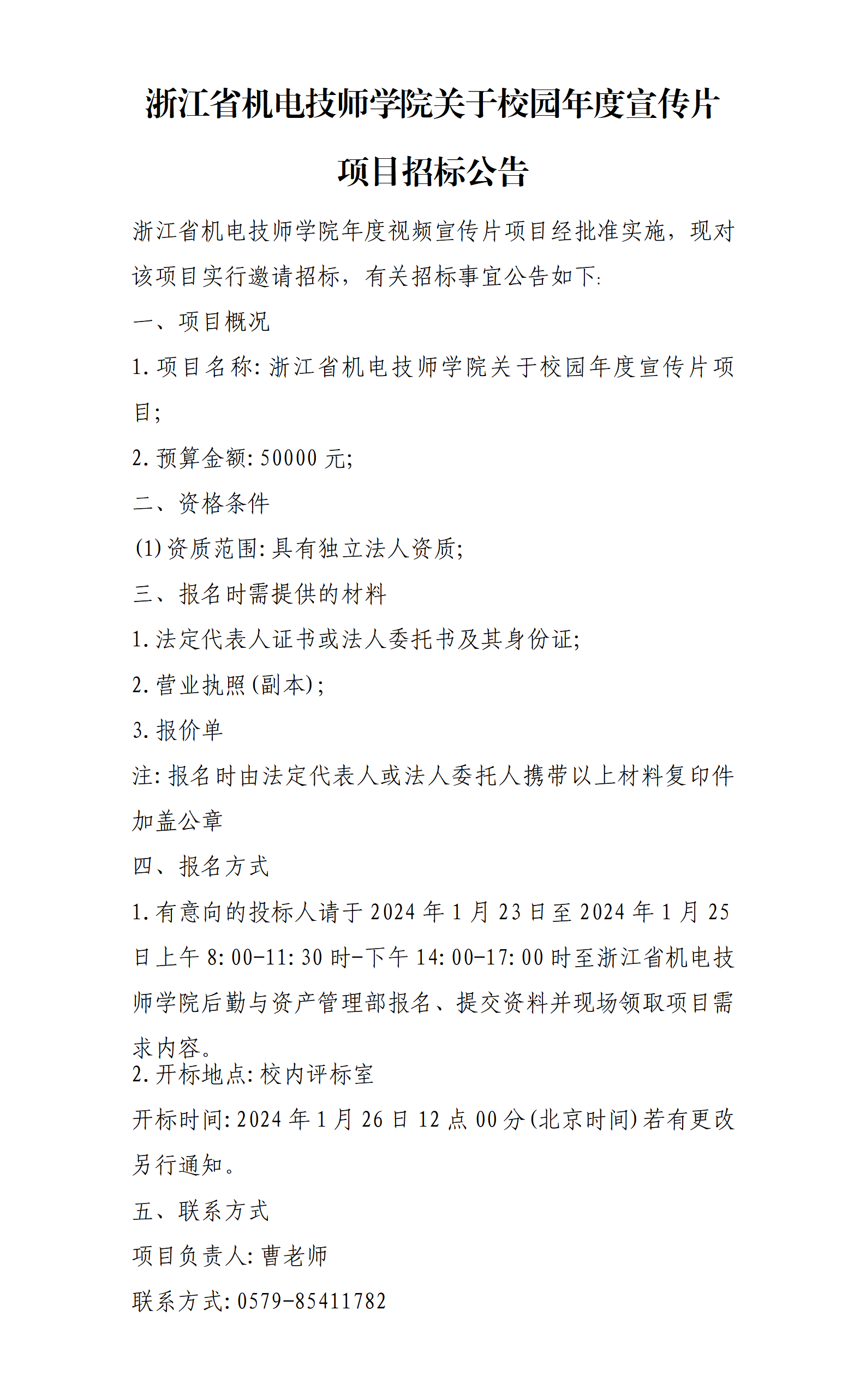 浙江省機電技師學院關于校(xiào)園年(nián)度宣傳片項目招标公告