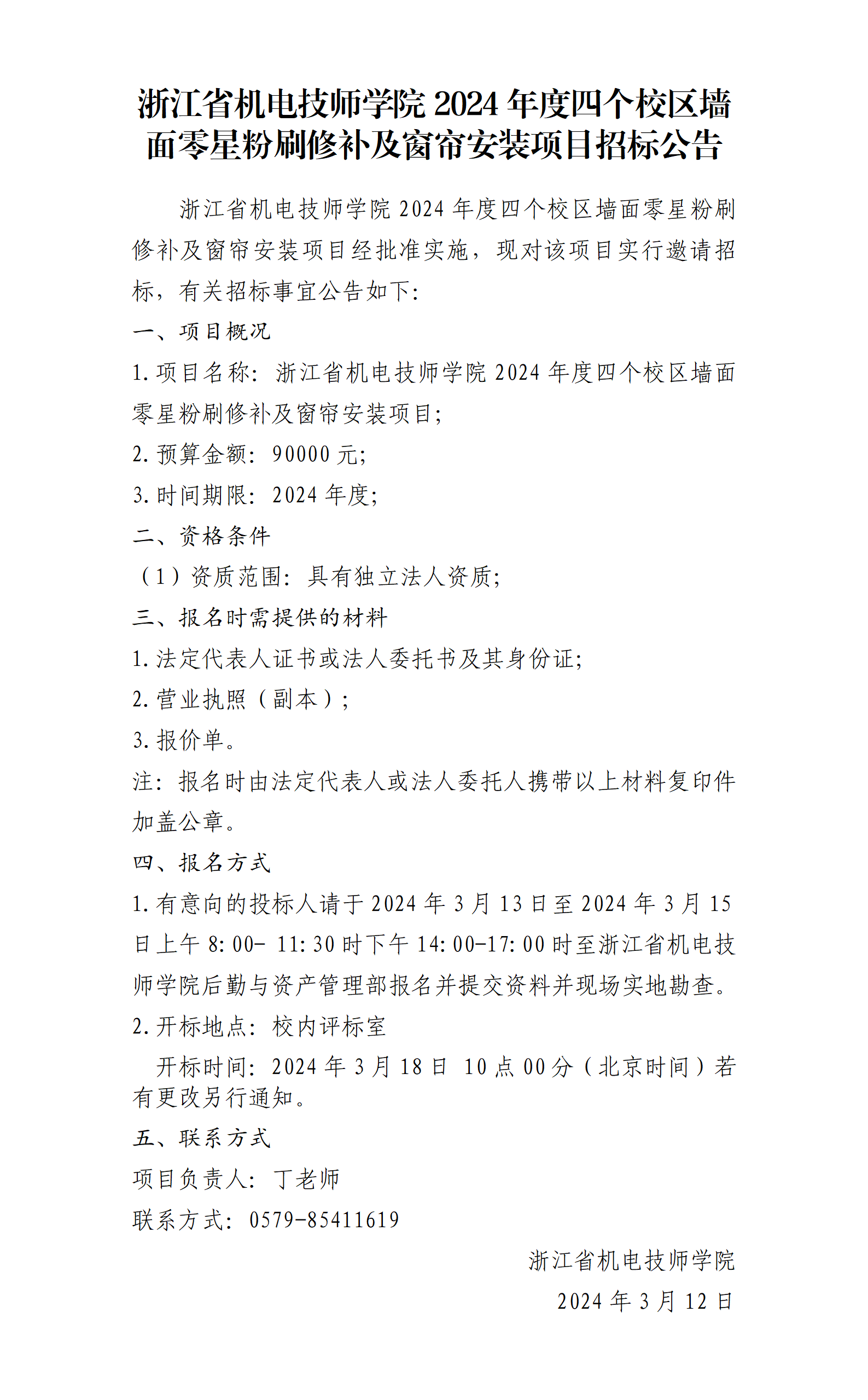 浙江省機電技師學院2024年(nián)度四個(gè)校(xiào)區(qū)牆面零星粉刷修補及窗(ch€uāng)簾安裝項目招标公告