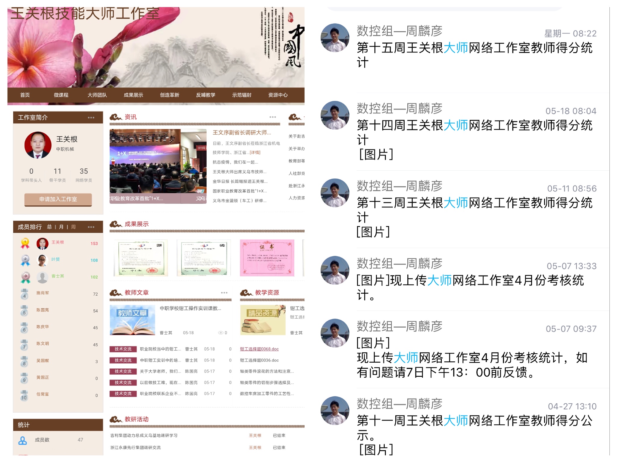周麟彥老(lǎo)師(shī)持續進行(xíng)王關根網絡大(dà)師(shī)工(gōng)作(zuò)室建設,每周做(zuò)好(hǎo)資源♠、文(wén)章(zhāng)的(de)上(shàng)傳工(gōng)作(zuò)及相(xiàng)關內(nèi)容的(de)更新,并對(duì)考核數(shù)據進行(xíng)通δ(tōng)報(bào)。