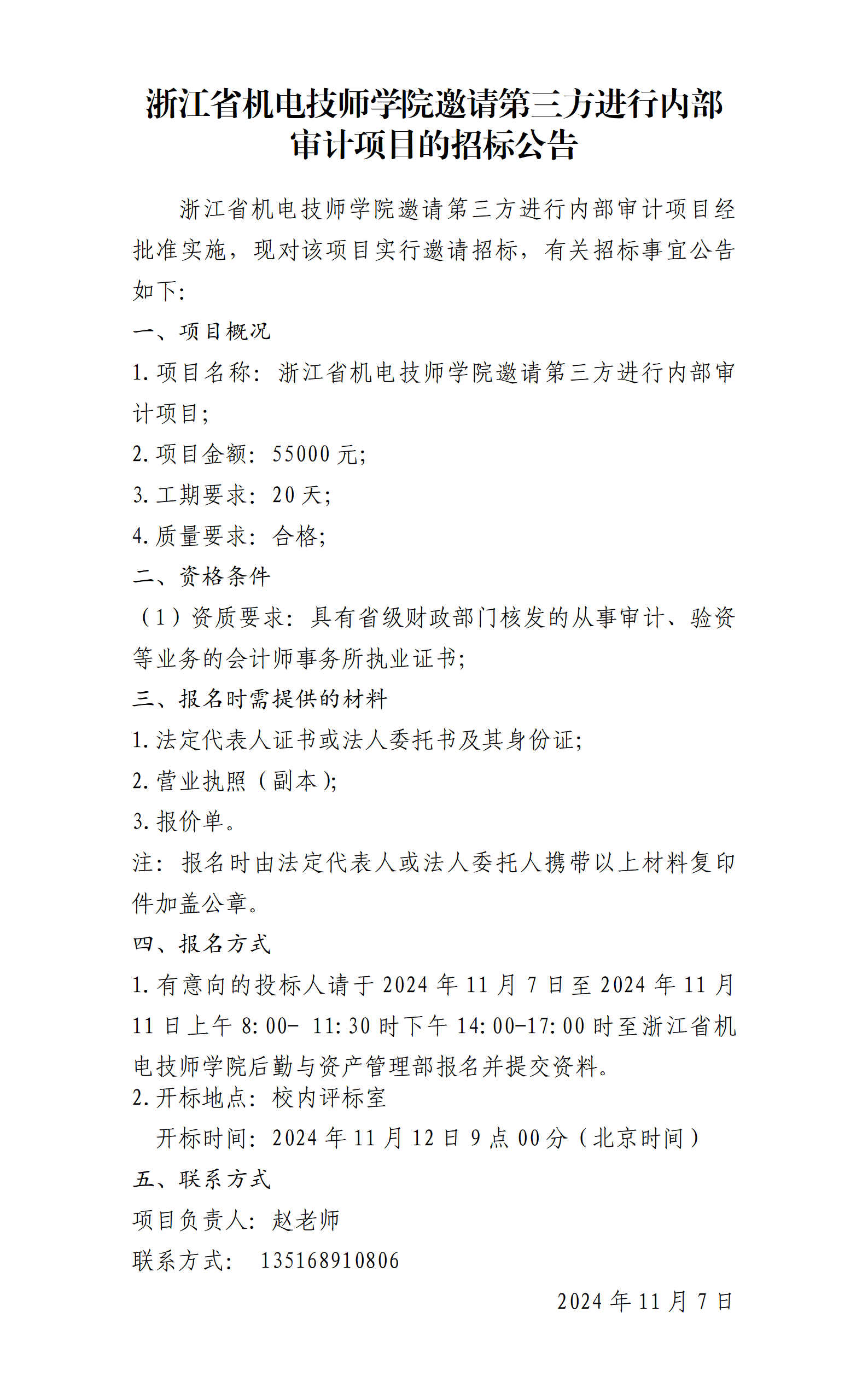 浙江省機電技師學院邀請(qǐng)第三方進行(xíng)內(nèi)部審計(jì)項目的(de)招标公告