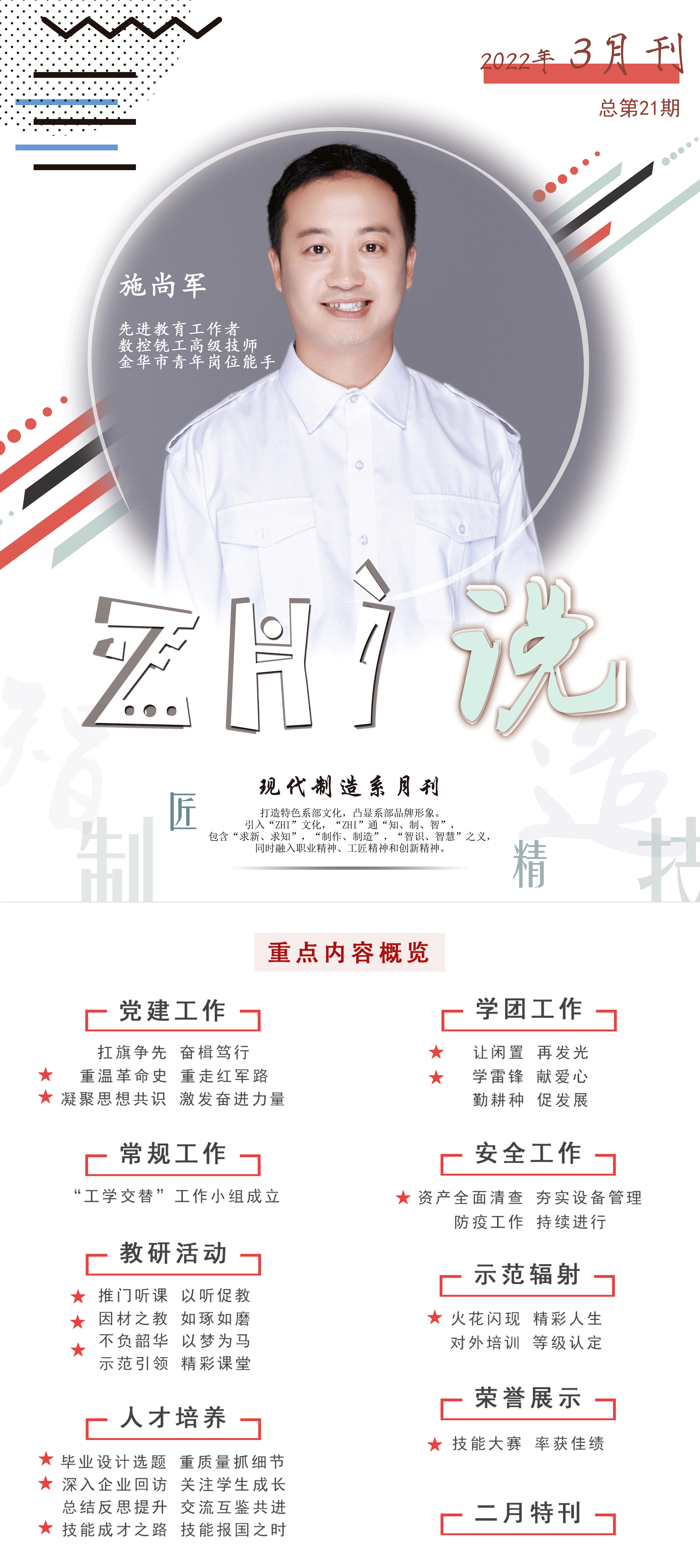 施尚軍,中共黨員(yuán),數(shù)控銑工(gōng)高(gāo)級技(jì)師(shī)、數(shù)控教研組組長(c¶háng)、浙江省技(jì)能(néng)大(dà)師(shī)工(gōng)作(zuò)室主要(yào) 成員(yuán)之一(yī)。積極指導學生(shēng)技(jì)能(néng)大(dà)賽榮獲市(shì)級獎項17項;積極參加教師(shī)技(jì)能(néng)大(d←à)賽、教師(shī)教學能(néng)力大(dà)賽,榮獲省級獎項3項、市(shì)級獎項5項;積極參與教♣科(kē)研項目,參與省級課題3項,市(shì)級課題2項,榮獲省級職業(yè)教育優秀教科(kē)研一(yī)等獎2項;積極參與編寫《數(shù)控銑加工( gōng)技(jì)術(shù)》、《數(shù)控車(chē)加工(gōng)技(jì)術(shù)》、《數(shù)控綜合技'(jì)術(shù)應用(yòng)》三門(mén)數(shù)控專業(yè)核心課程教材,在浙江大(dà)學出版社正式出版。撰寫論文(wén)在國(guó)家(jiā)級核★心刊物(wù)發表3篇,在浙江省職業(yè)教育優秀論文(wén)評比獲得(de)一(yī)等獎3次。開(kāi)發實用(yòngβ)新型專利4項。2020年(nián)獲評“金(jīn)華市(shì)青年(nián)崗位能(néng)手”,并多(duō")次評為(wèi)校(xiào)級先進個(gè)人(rén)、優秀教育工(gōng)作(zuò)者、師(↑shī)德标兵(bīng)、優秀黨員(yuán)、技(jì)能(néng)标兵(bīng)、教學之星等榮譽稱号。