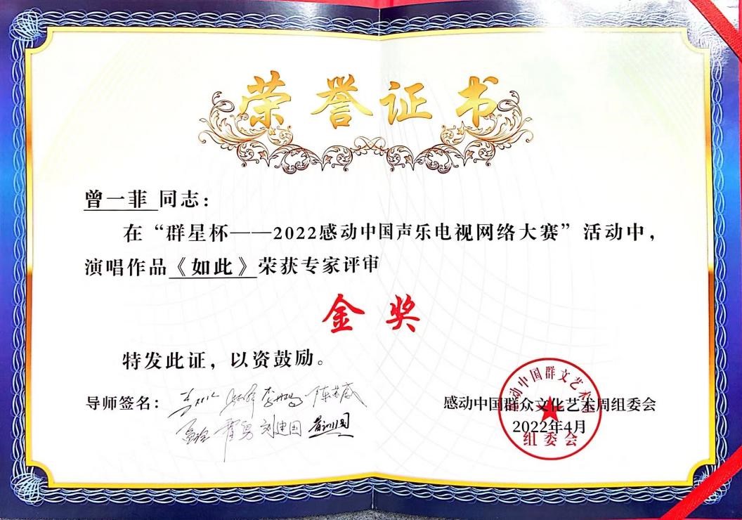 2022年(nián)4月(yuè)11日(rì),“群星杯”第三屆中國(guó)聲樂(yuè)電(diàn)視(shì)網絡大(dà)賽評選活動落下(xià)帷幕,應用(yòng)設計(®jì)系21級藝術(shù)表演專業(yè)學生(shēng)曾一(yī)菲同學,經過多(duō)輪PK賽,專家(jiā")評審獎最終流行(xíng)組金(jīn)獎第一(yī)名授予曾一(yī)菲。