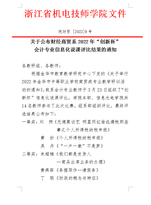 關于公布财經商貿系2022年(nián)“創新杯” 外(wài)貿專業(yè)信息化(huà)說(shuō)課評比結果的(de)通(tōn™g)知(zhī)