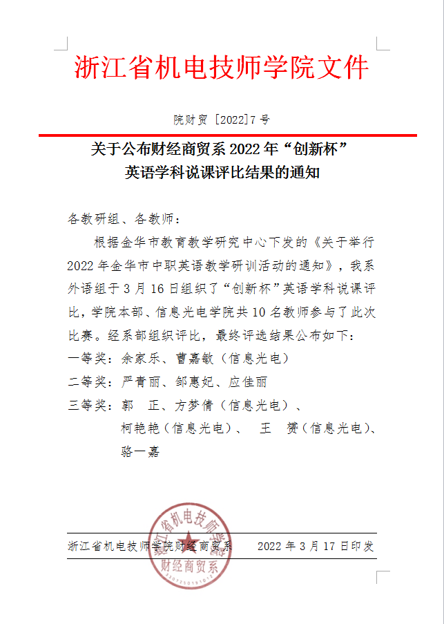 關于公布财經商貿系2022年(nián)“創新杯” 英語學科(kē)說(shuō)課評比結果的(de)通(tōng)知(zhī)
