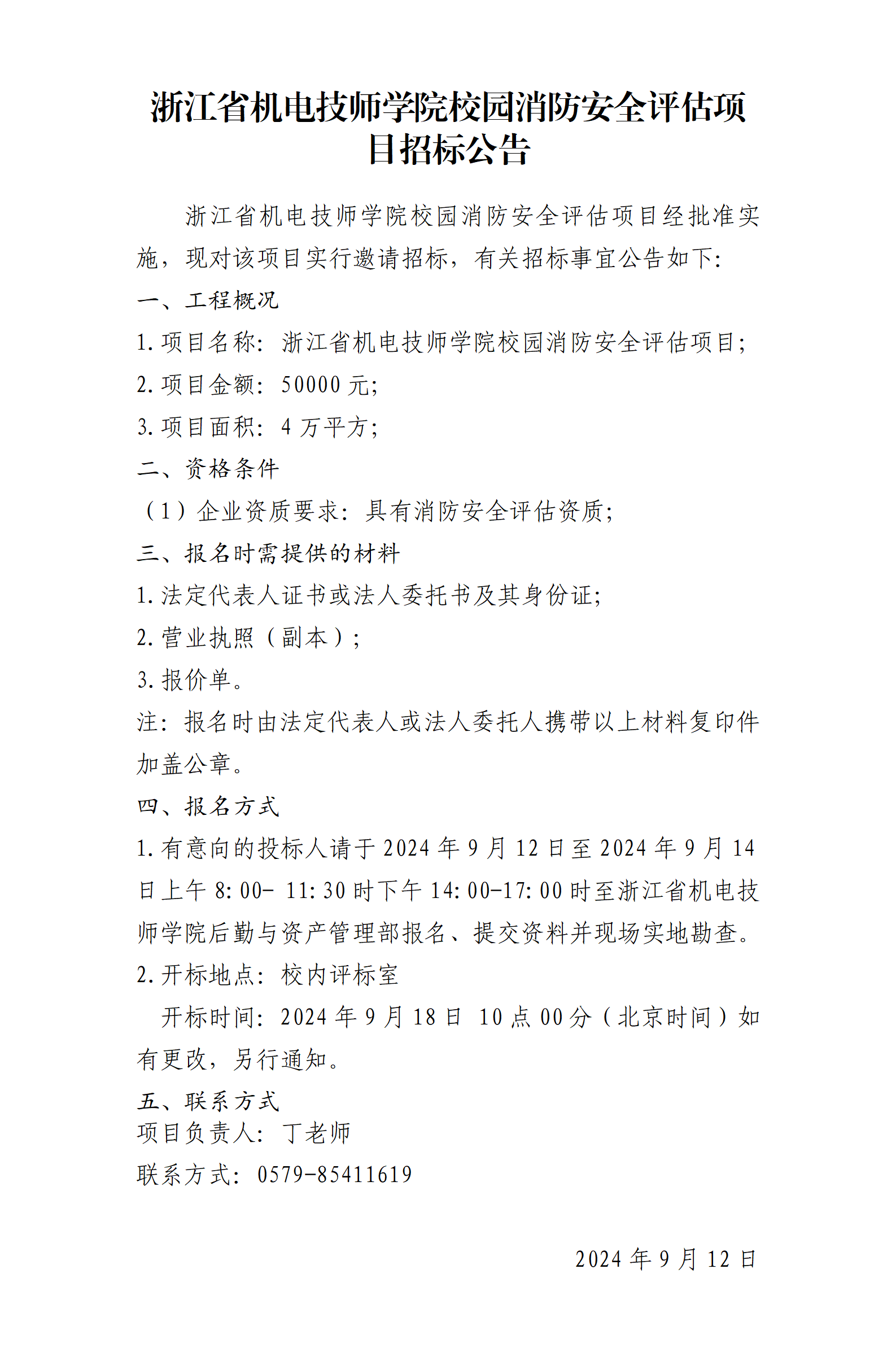 浙江省機電技師學院校(xiào)園消防安全評估項目招标公告