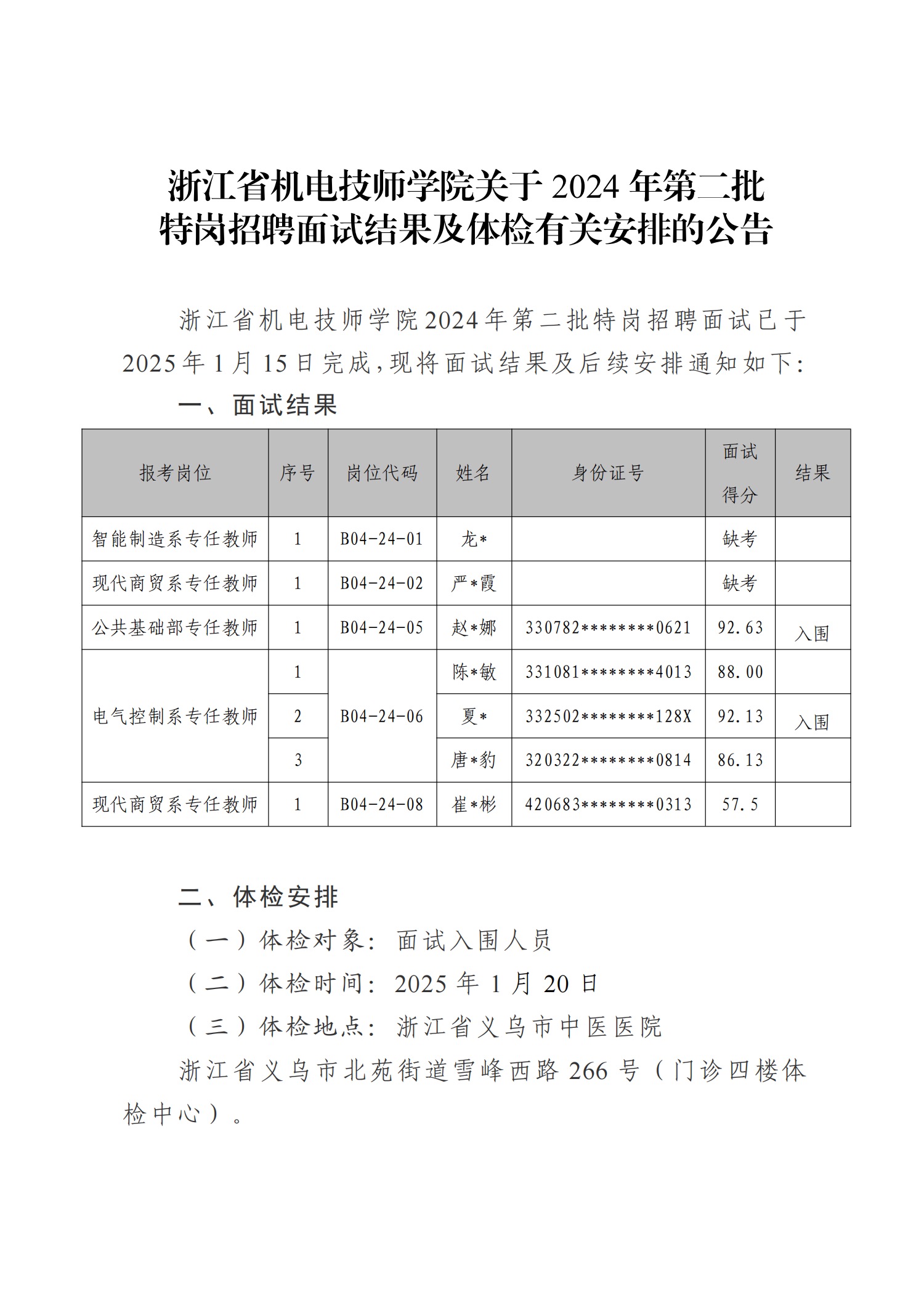 浙江省機電技師學院關于2024年(nián)第二批特崗招聘面試結果及體(tǐ)檢有(yǒu)關安排的(de)公告