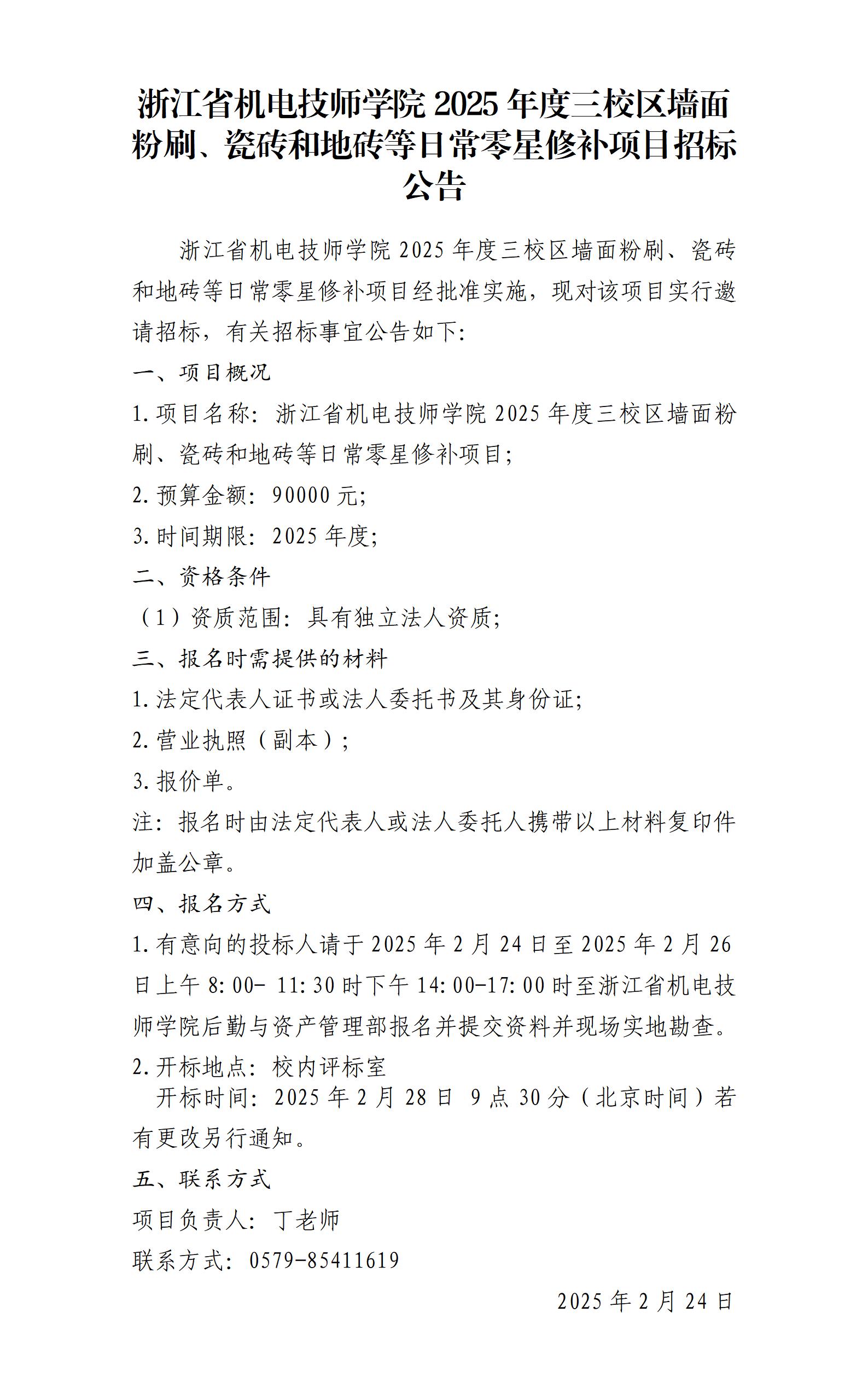 浙江省機電技師學院2025年(nián)度三校(xiào)區(qū)牆面粉刷、瓷磚和(hé)地(dì)♦磚等日(rì)常零星修補項目招标公告