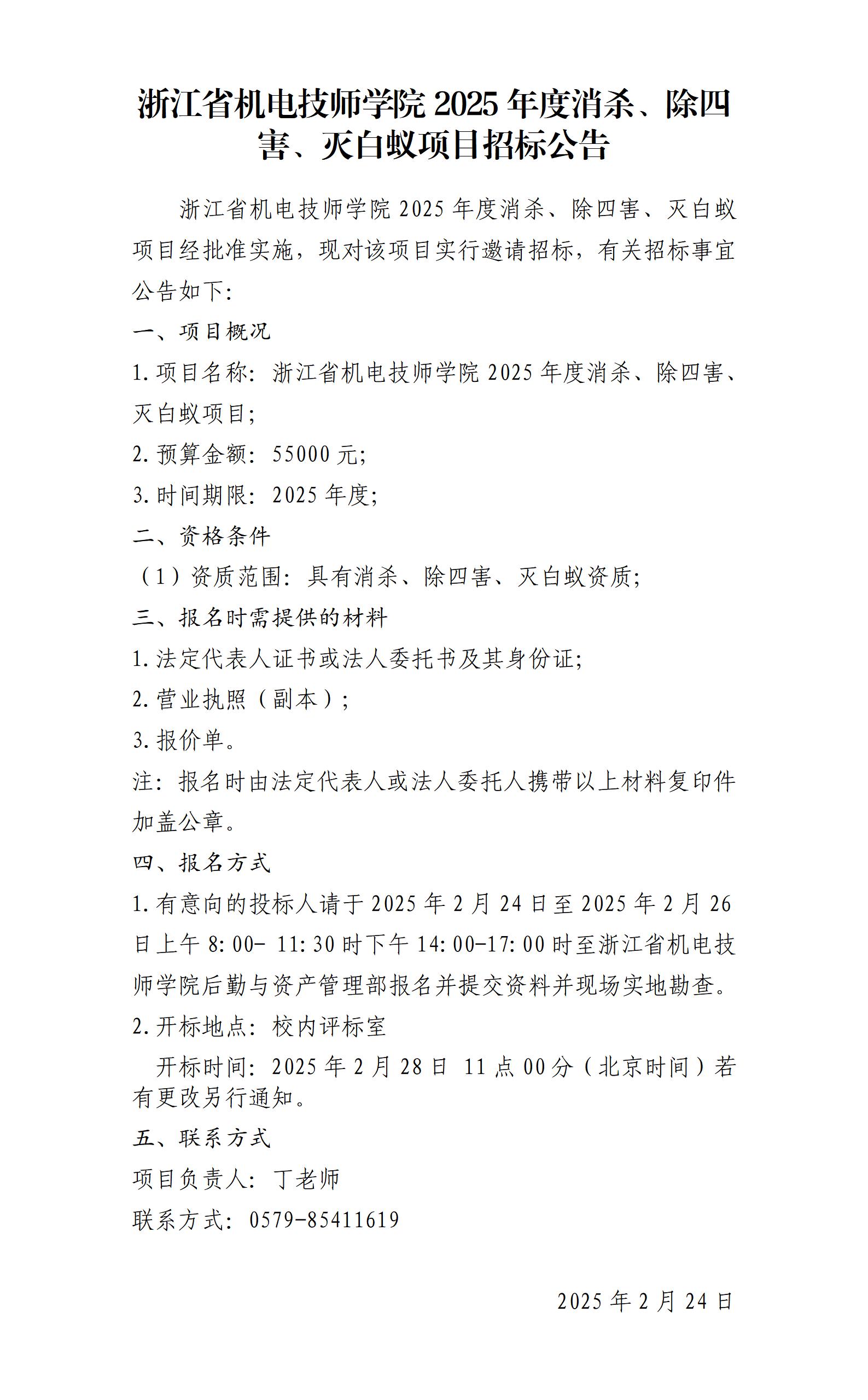 浙江省機電技師學院2025年(nián)度消殺、除四害、滅白(bái)蟻項目招标公告