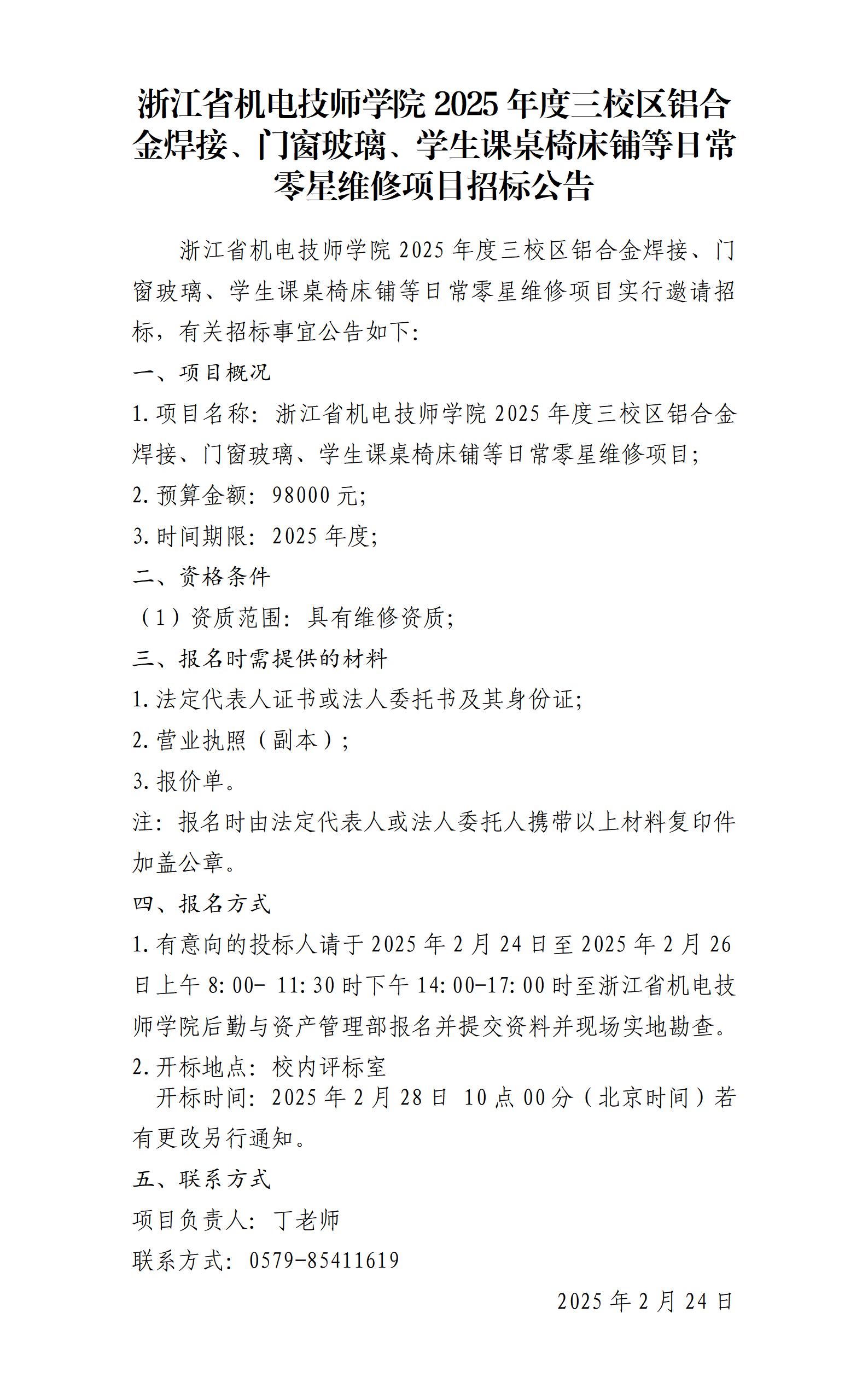 浙江省機電技師學院2025年(nián)度三校(xiào)區(qū)鋁合金(jīn)焊接、門(mén)窗(chuāng)玻璃、學生(shēng)課桌椅床鋪等日(rì)常零星維修項目招标公告