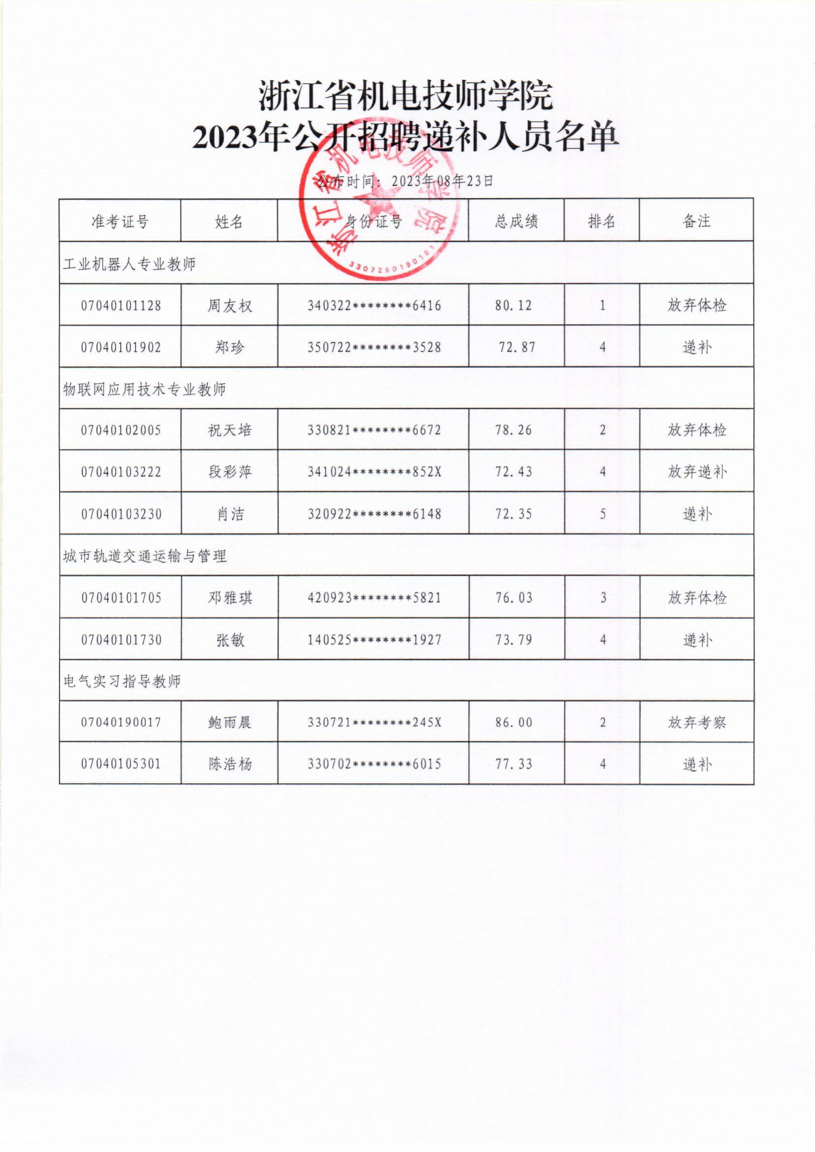 浙江省機電技師學院2023年(nián)公開(kāi)招聘遞補人(rén)員(yuán)名單