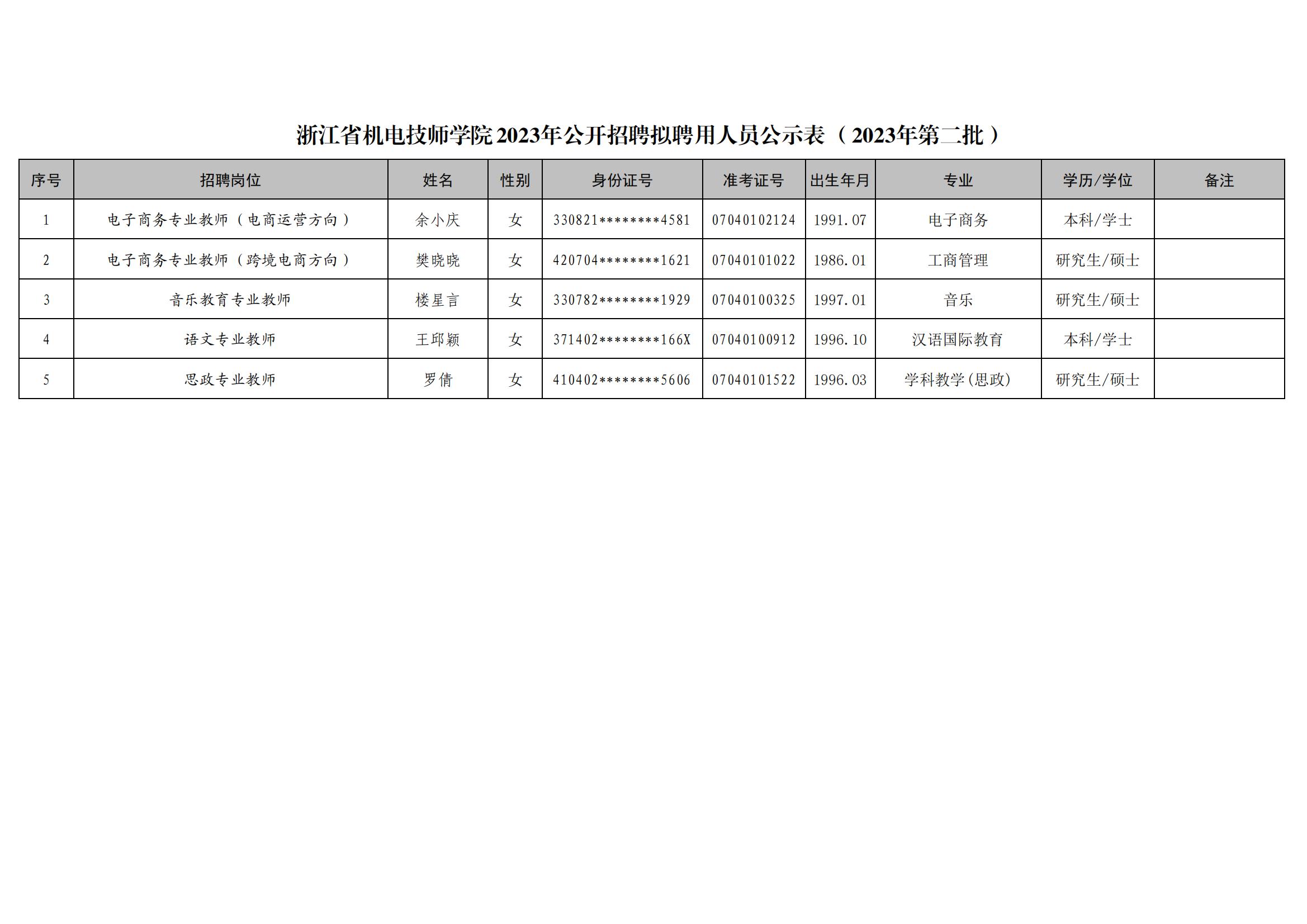 浙江省機電技師學院2023年(nián)公開(kāi)招聘拟聘用(yòng)人(rén)員(yuán)公示表(2023年(nián)第二批)