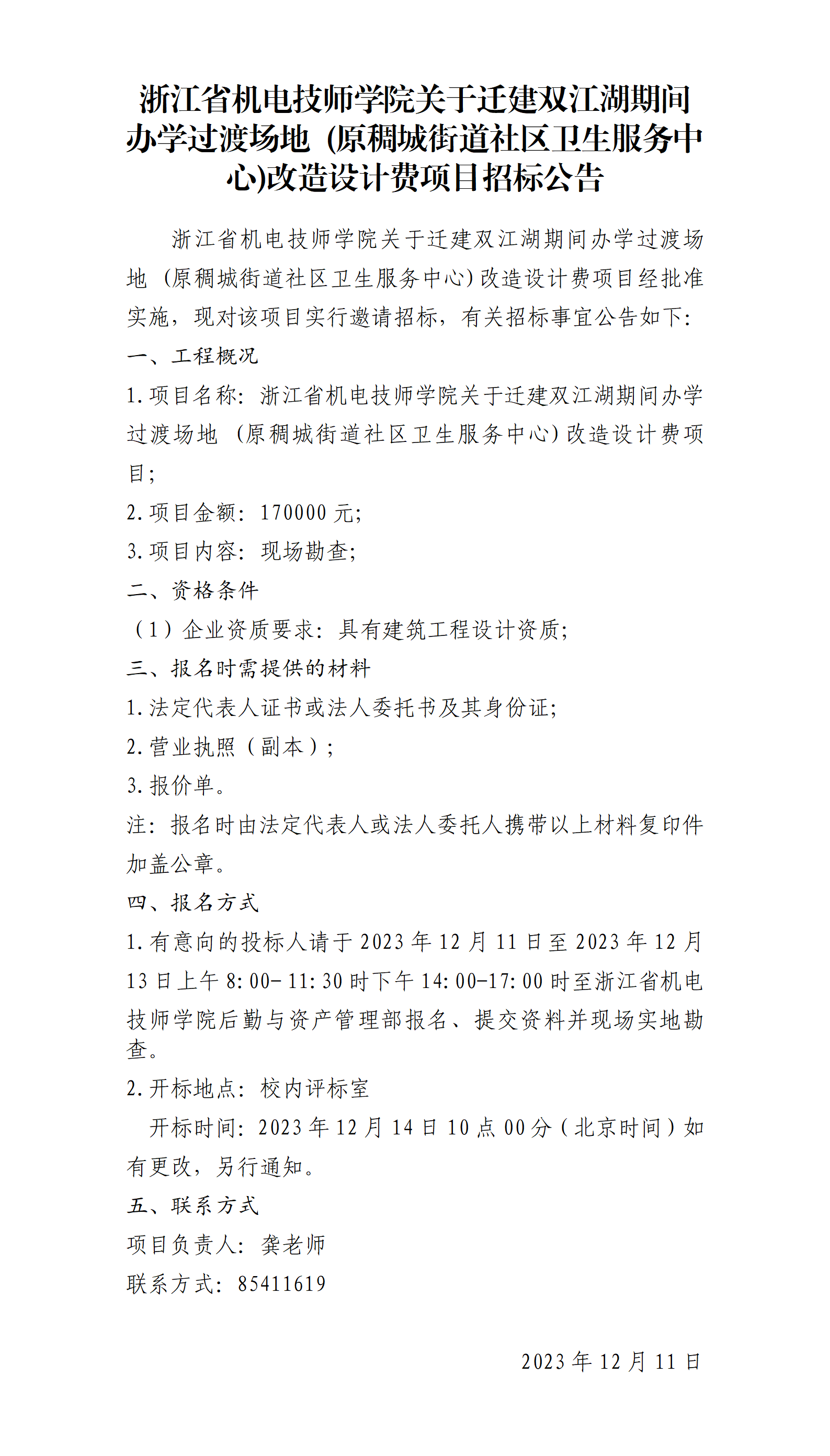 浙江省機電技師學院關于遷建雙江湖(hú)期間(jiān)辦學過渡場(chǎng)地(dì) (原稠城(chéng)街(jiē)道(dào)社區(qū)衛生(sh ēng)服務中心)改造設計(jì)費(fèi)項目招标公告