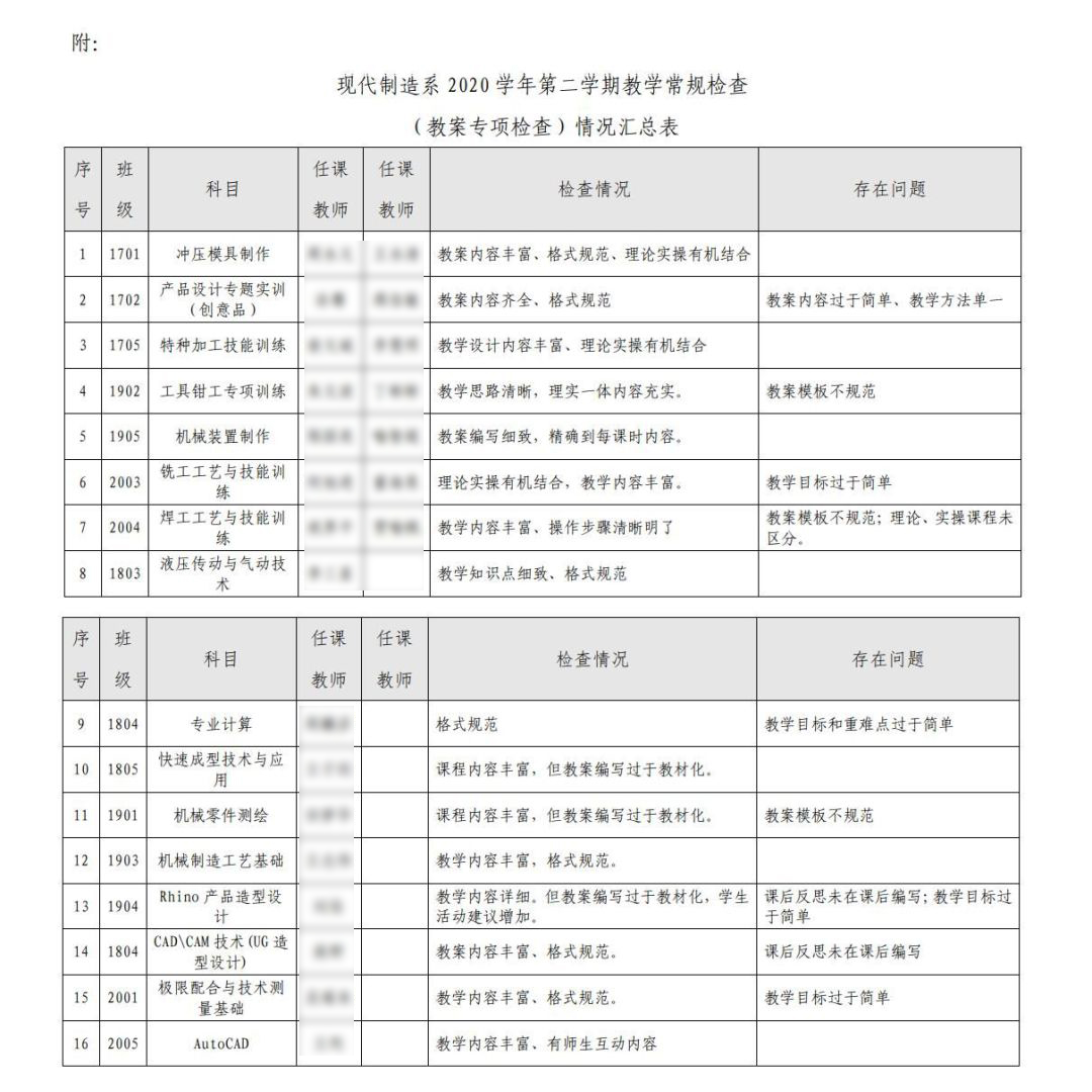 為(wèi)規範教育日(rì)常,提升教學質量,按照(zhào)《2020學年(nián)第二學期現(xiàn)代制(zhì)造系督®導工(gōng)作(zuò)計(jì)劃》要(yào)求,系督導組成立檢查小(xiǎo)組,對(duì)抽查到(dào)的(de)教師(shī)上(shàng)交 的(de)教案開(kāi)展專項督查工(gōng)作(zuò)。