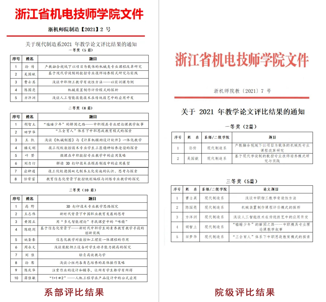 根據義烏市(shì)教育研修院下(xià)發的(de)《關于組織 2021 年(nián)義烏市(shì)中小(xiǎo)學、幼兒(ér)園教學論文(wén§)評比的(de)預發通(tōng)知(zhī)》,全系共上(shàng)交論文(wén) 43 篇,經系部評選後報(bào)送教務處參加院級評比。評比結果公布如(rú)下(xi✔à)(各等級排名不(bù)分(fēn)先後):