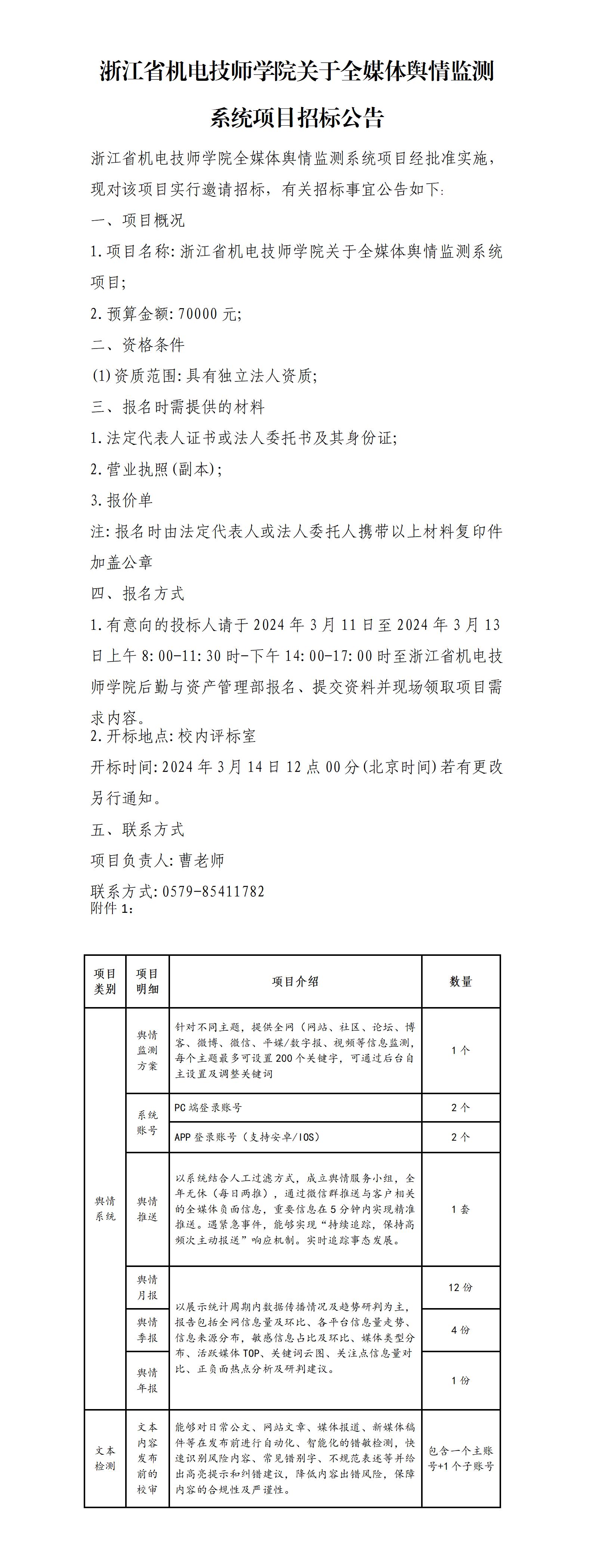 浙江省機電技師學院關于全媒體(tǐ)輿情監測系統項目招标公告