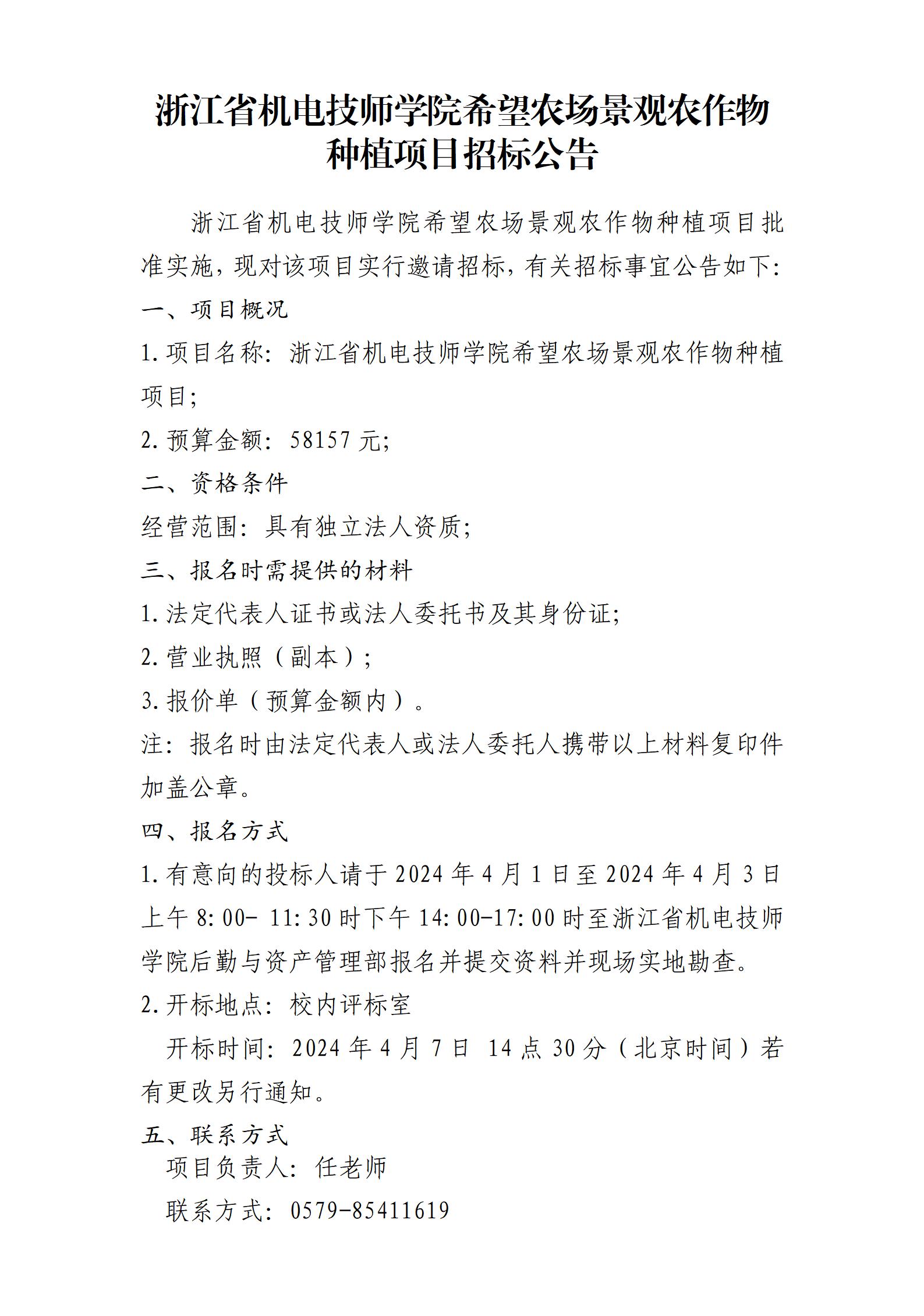 浙江省機電技師學院希望農(nóng)場(chǎng)景觀農(nóng)作(zuò)物(wù)種植項目招标公告