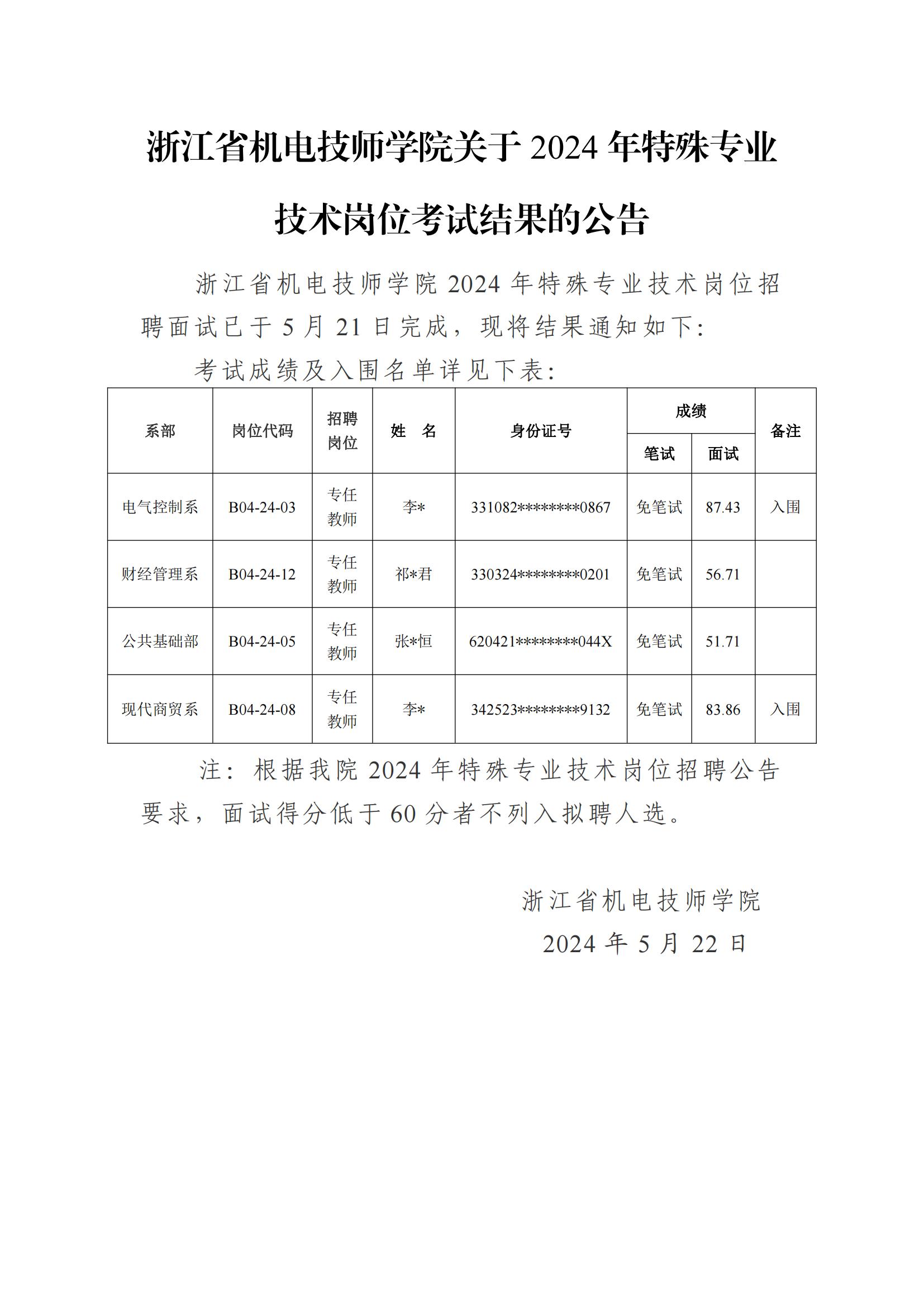 浙江省機電技師學院關于2024年(nián)特殊專業(yè)技(jì)術(shù)崗位考試結果的(de)公告