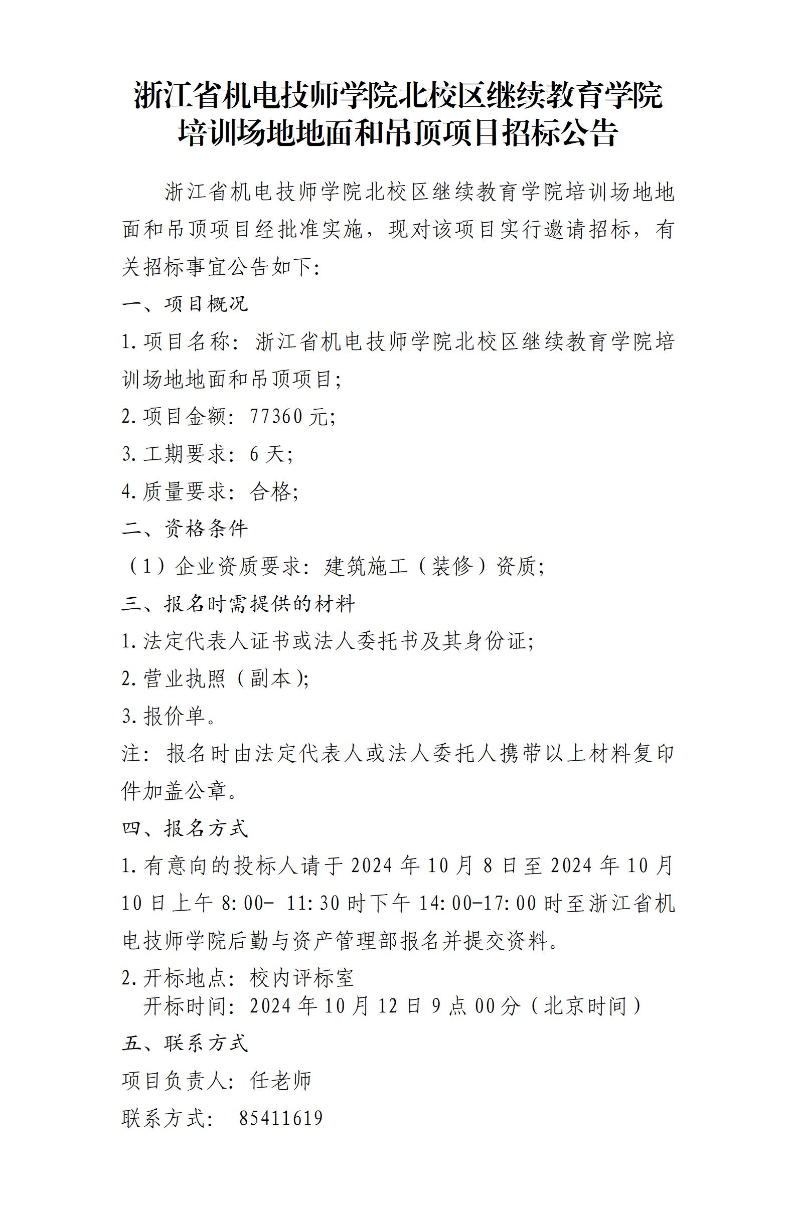 浙江省機電技師學院北(běi)校(xiào)區(qū)繼續教育學院培訓場(chǎng)地(dì)地(dì)面和(hé)吊頂項目招标公告
