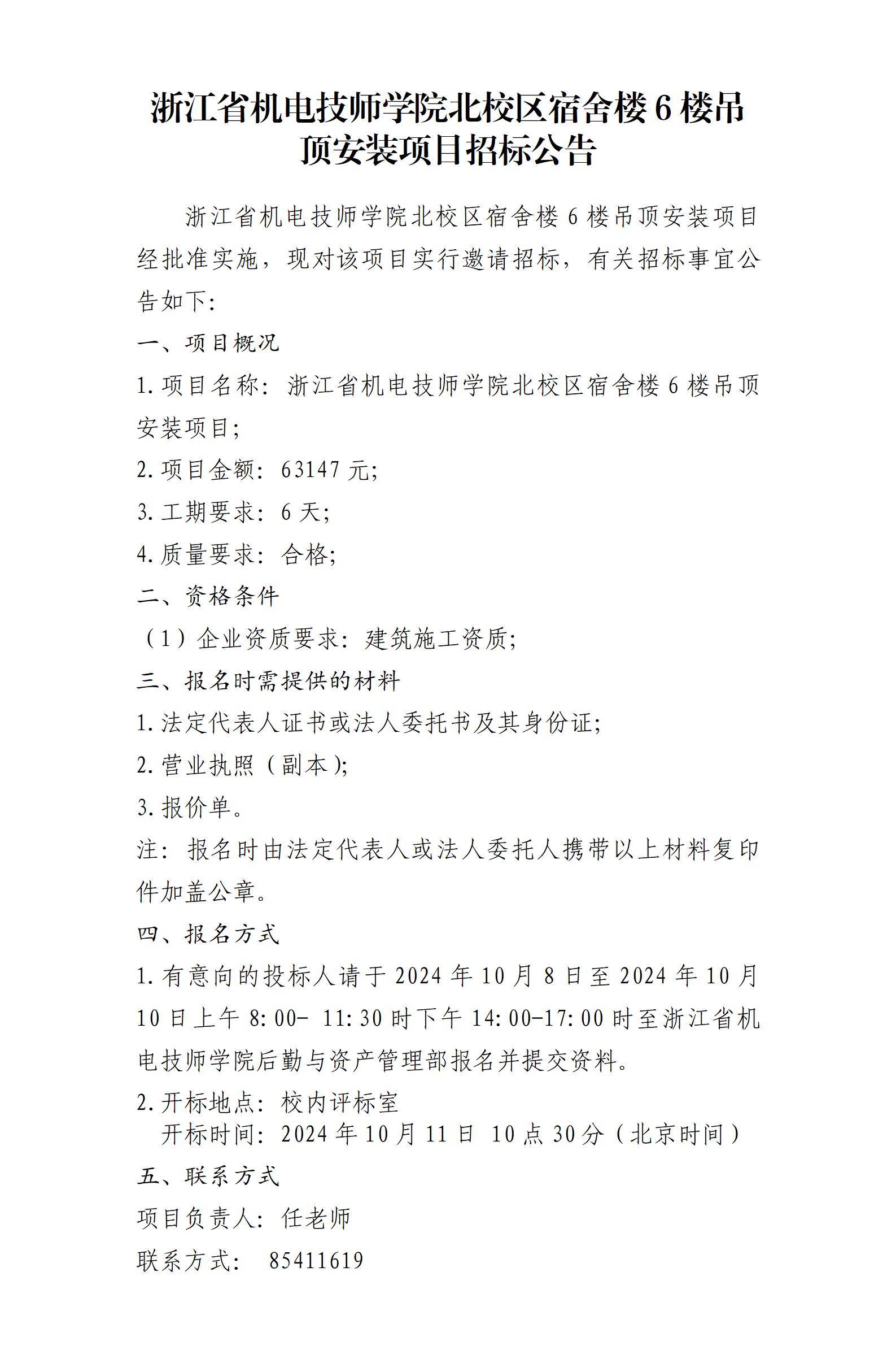 浙江省機電技師學院北(běi)校(xiào)區(qū)宿舍樓6樓吊頂安裝項目招标公告