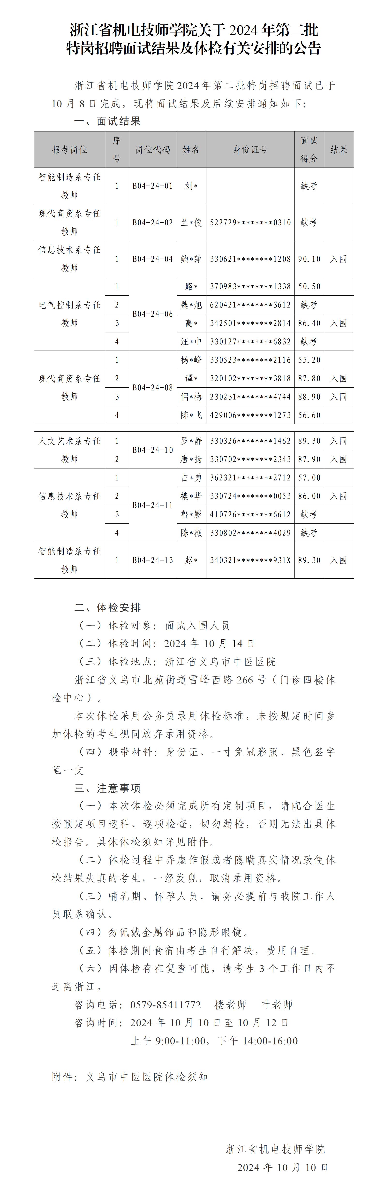 浙江省機電技師學院關于2024年(nián)第二批 特崗招聘面試結果及體(tǐ)檢有(yǒu)關安排的(de)公告