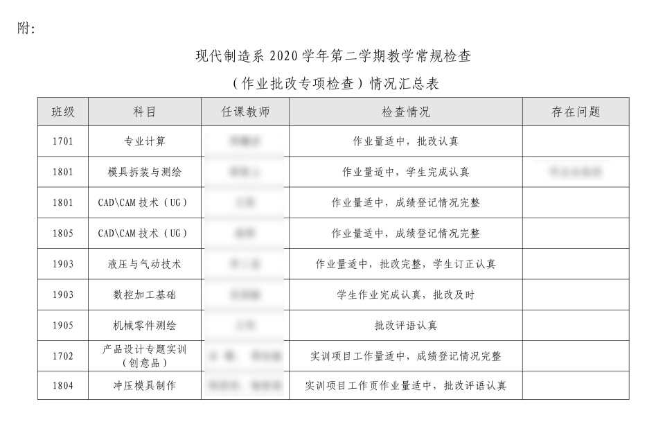 現(xiàn)代制(zhì)造系督導組根據《現(xiàn)代制(zhì)造系教師(shī)教學工(gōng)作(zuò )相(xiàng)關規定》中關于作(zuò)業(yè)批改要(yào)求,開(kāi)展了(le)作£(zuò)業(yè)批閱專項督導,以規範教育日(rì)常,提升教學質量,檢查結果為(wèi)總體(tǐ)作(z'uò)業(yè)批改整體(tǐ)情況較好(hǎo),作(zuò)業(yè)量布置适中并批改認真。